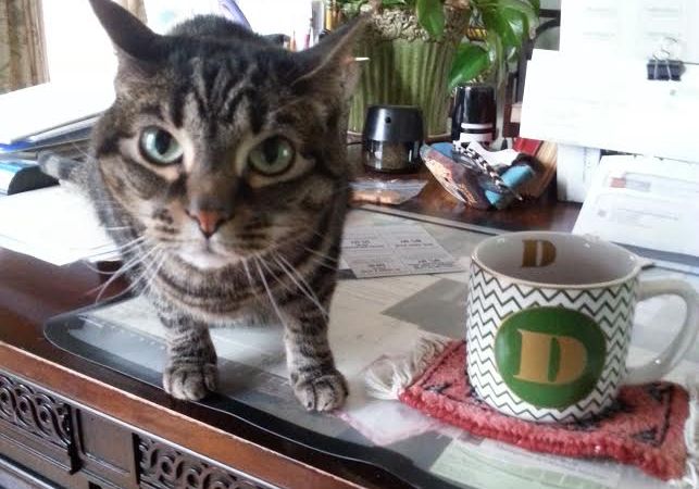 My sweet Gabbi, my grey, striped, talkative tabby, how you loved to sit with me while I banged away at my desk. No matter the hour you were at my side coaxing me along…and when you decided you’d had enough of my solitude, you silently crept into my line of vision. As you stared into the monitor with your back to me I had no choice but to work with my arms around you, stressing my neck, and eventually you found yourself on the floor. You’d have none of that so back up to my desk you pounced. After several rounds of this elevatoring for my attention, eventually you won and received your hard-earned ‘baby love’ session. But not today.