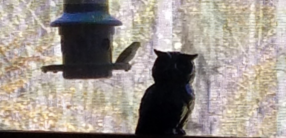 The blue, ceramic owl is perched inside my porch while Mr. Finch and friends are gathered at their favorite feeding spot about three feet beyond. Thank you Cee for another Fun Foto Challenge!