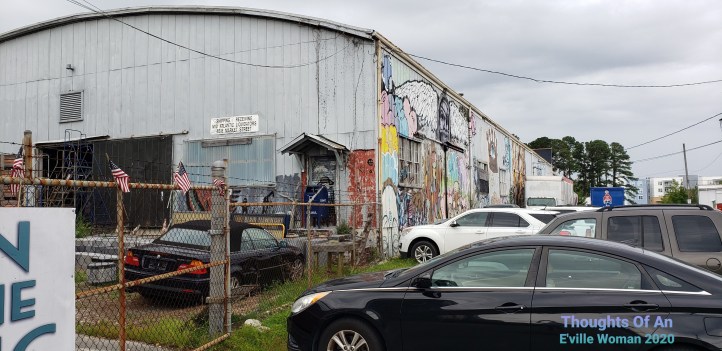 We were visiting various antique and upcycle stores in the Wilmington area recently and came across this colorful spot. I’m having difficulty recalling the name of this interesting store, I think it may the The Wherehouse. They offer an eclectic shopping experience and worth a trip if you’re in the area. I had to share with Scooj, who documents interesting street art on the blog Natural Adventures. I had difficulty getting better photos due to the many cars surrounding the buildings but you can at least appreciate the scale and colors here.