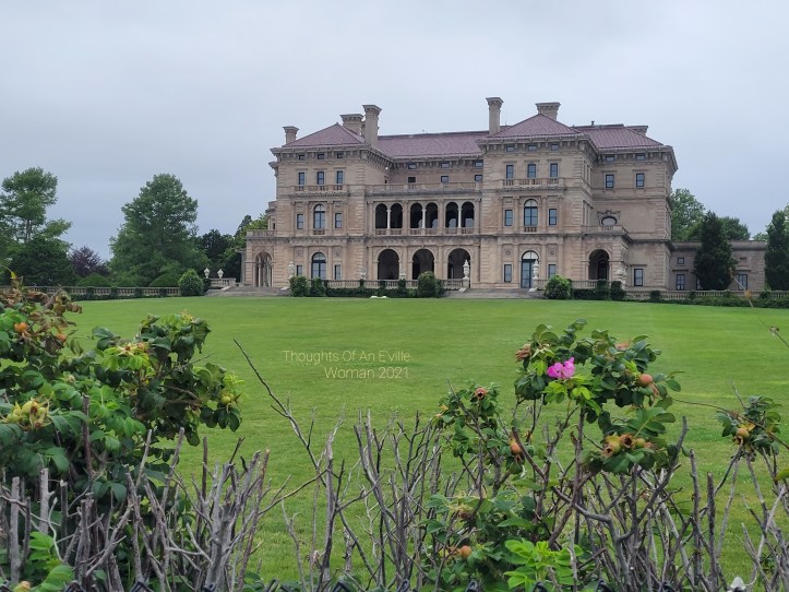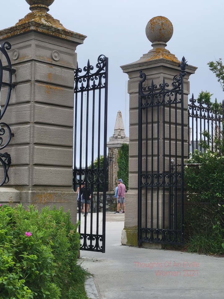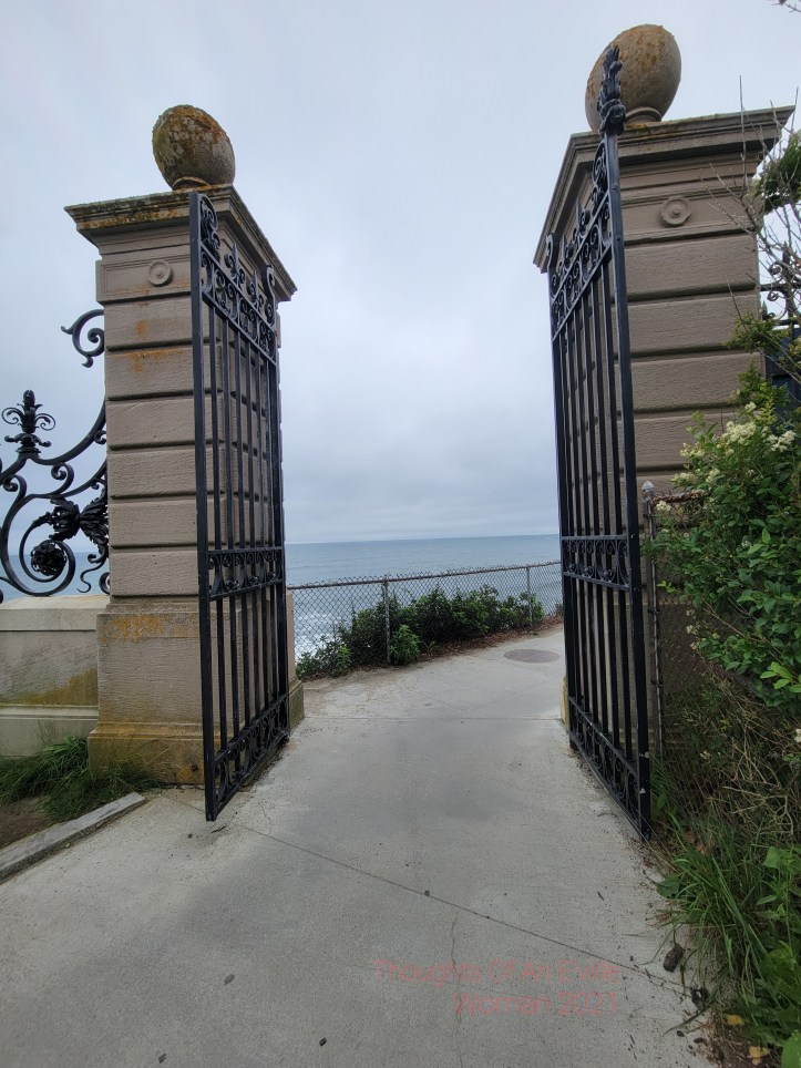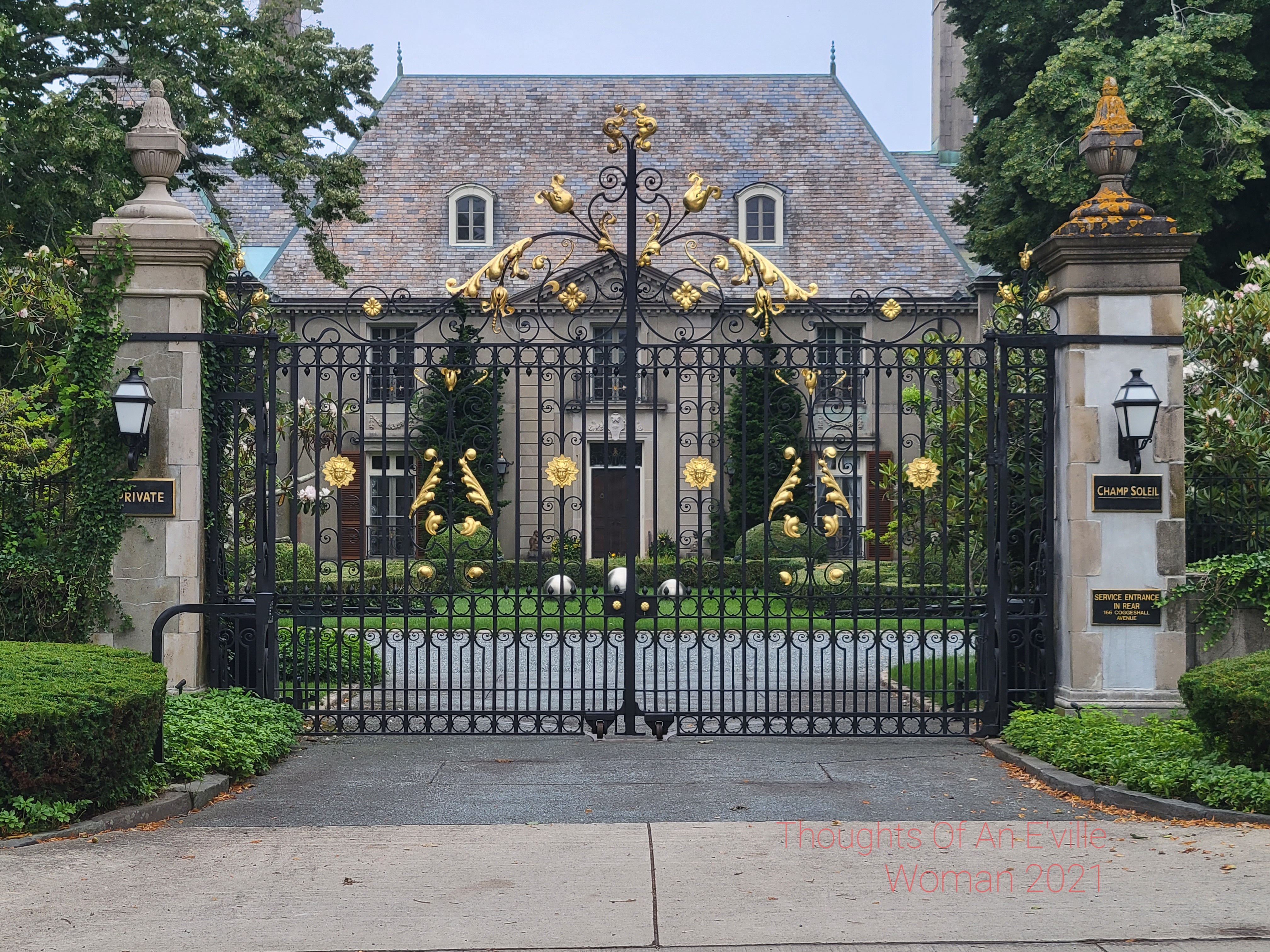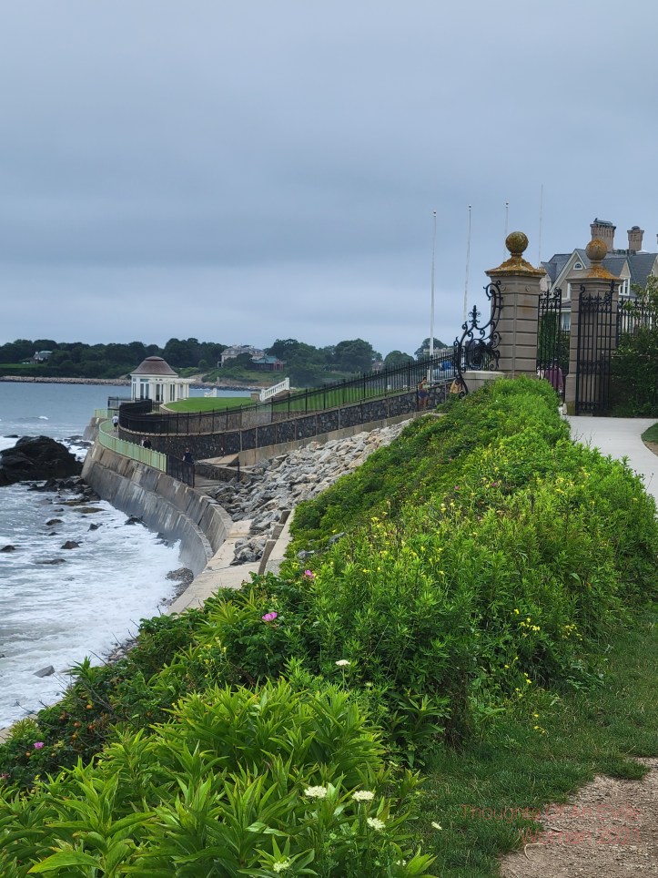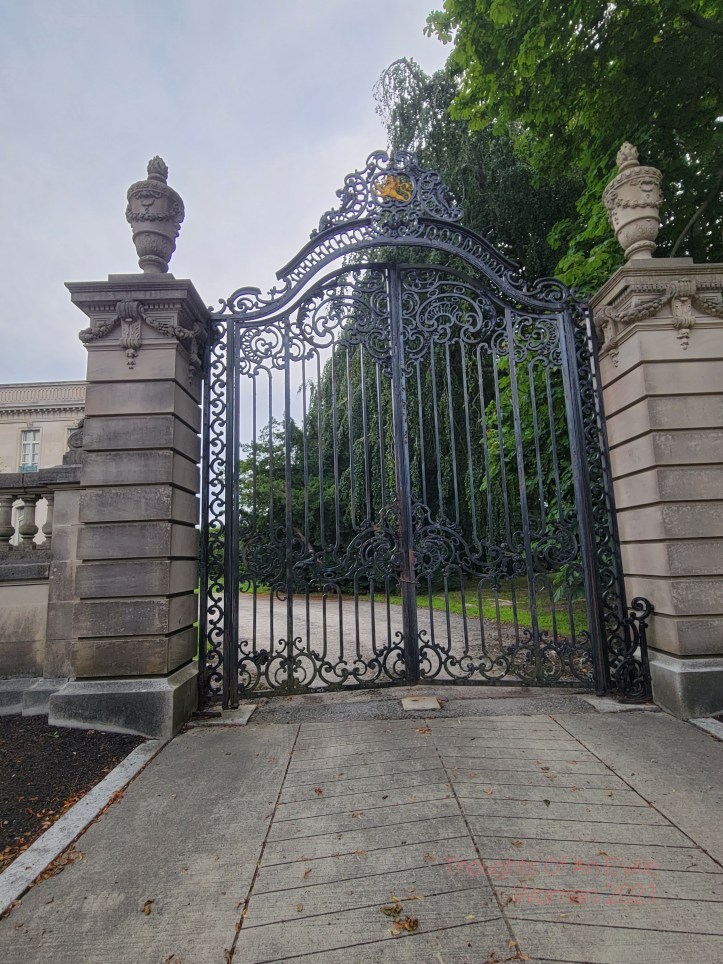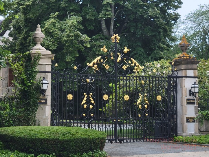 If ever you get to Newport I highly recommend a ‘stroll’ along the historic Cliff Walk which gives you breathtaking views of many of these mansions while walking along the Rhode Island coast. These gates are along the walk nearing the Breakers, the well known Vanderbilt home. We took time to take the tour of the Breakers, ornate inside and out, but I now realize I DID NOT GET A GATE PHOTO…heavy sigh…but here is a view from the walk.