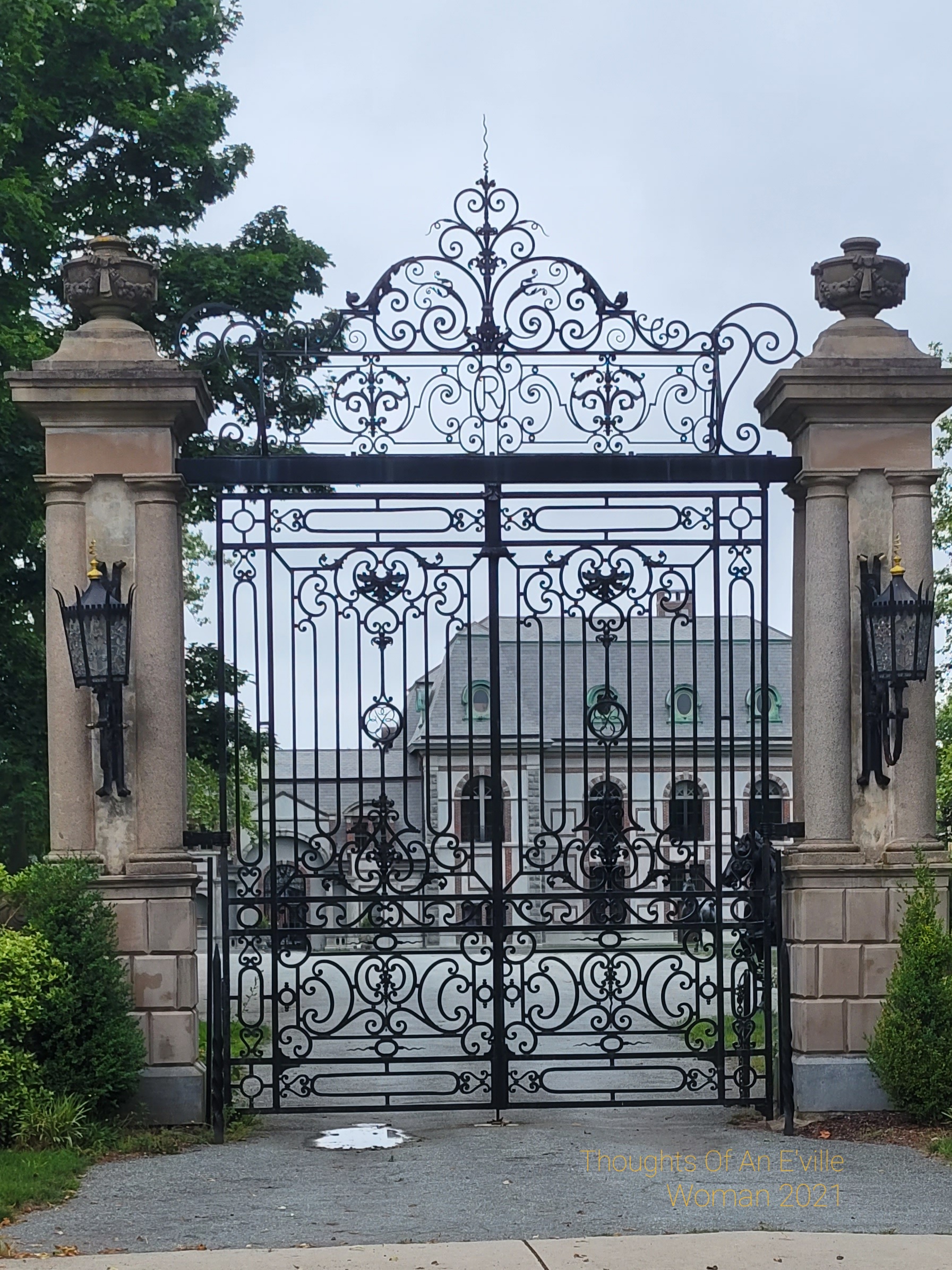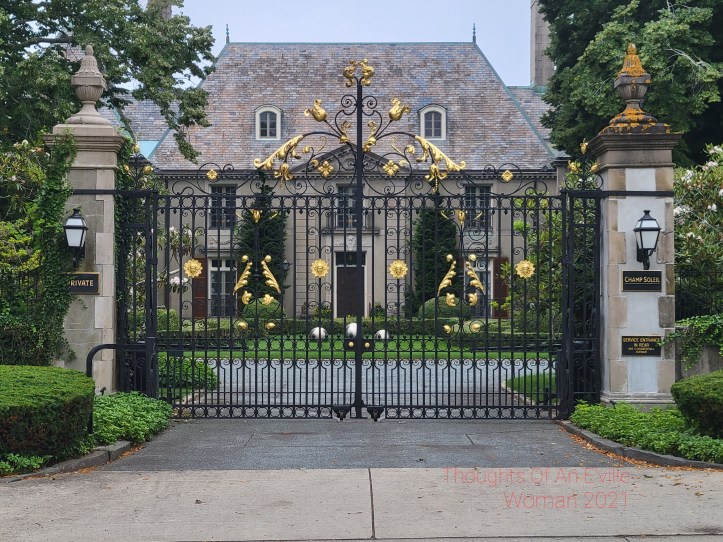This gold and black iron gate belongs to Champ Soleil. It was originally built between 1870 and 1880, has had several names and owners, but most notably owned by the Drexels of the banking world and Drexel University. Sadly, the mansion experienced two major fires, first in 1914 and recently in 2016. Following the 2016 fire it was completely rebuilt into its current iteration, Champ Soleil.