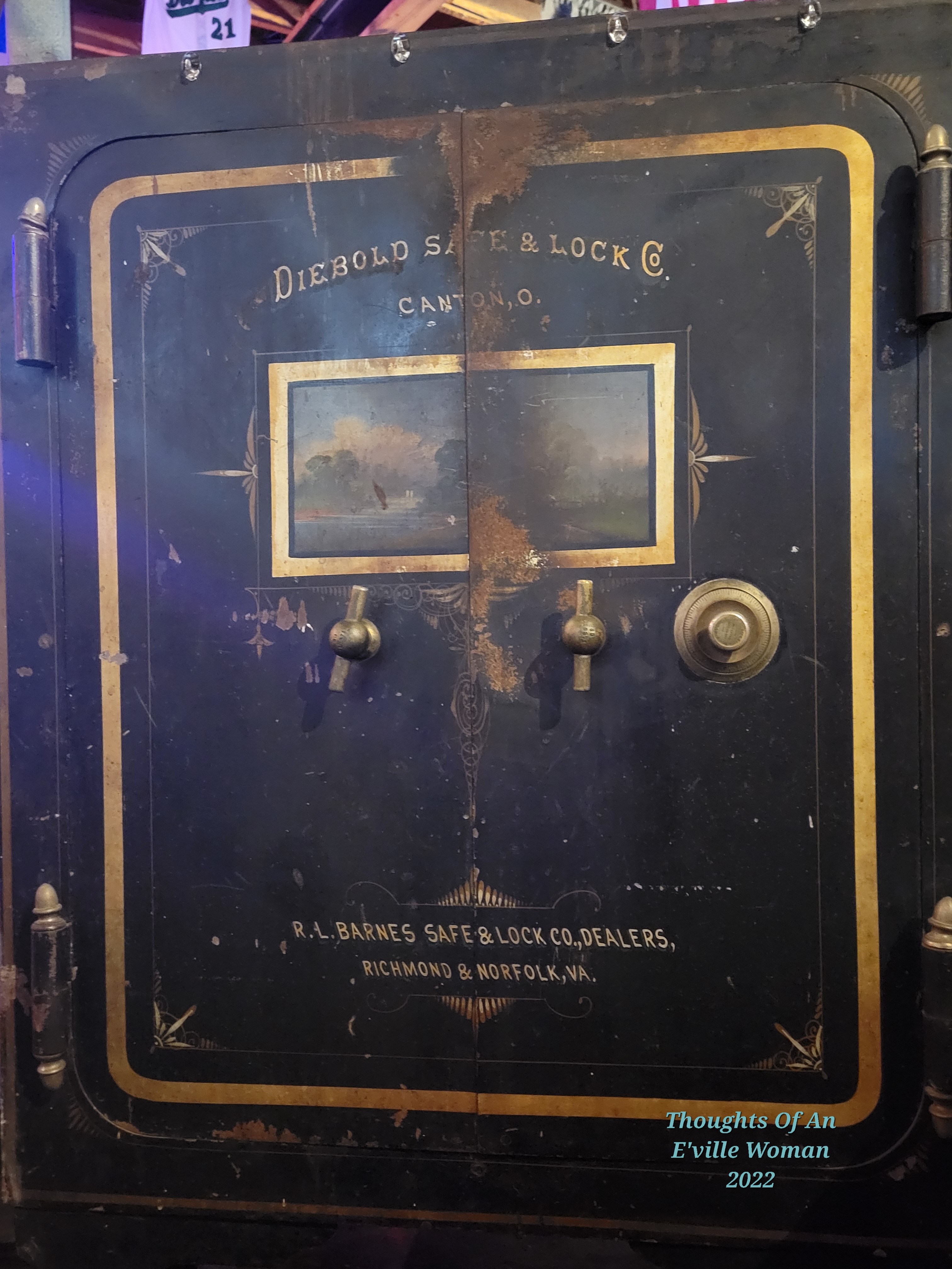 This is my first door post for 2022 and because I’ve not been anyplace new recently, I searched my photos to see if by some slim chance I had a door in my arsenal to post for Dan’s Thursday Doors challenge. Yep, I had this forgotten door I photographed in a North Carolina bar. I remember we were waiting at our table for refreshments to arrive and just barely out of reach I saw this odd, black box next to a neighboring table. Realizing it was a safe, and an odd find in this random bar, I decided to zoom in to read it’s door. Only after taking the picture could I read the wording, a safe from my hometown, Richmond, VA. (My son now lives in Norfolk so doubly meant to be. AND, I lived in Ohio for a short minute, Columbus, not Canton So triply? meant to be). As I study this antique door I am remembering a story I was once told, and only once, about a relative who was a rather notorious safe cracker in his day. Wish I knew all the sordid details to share with you. Or do I?