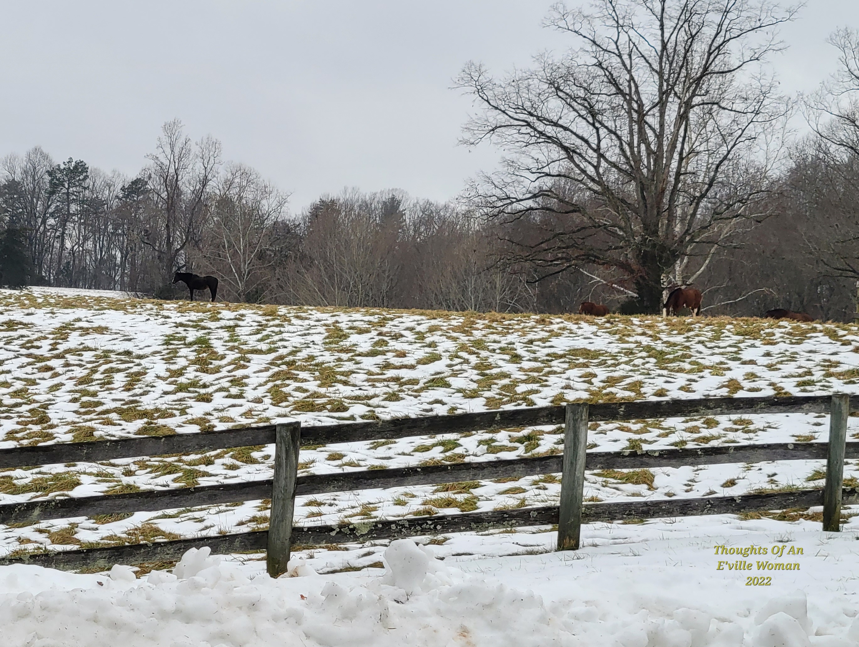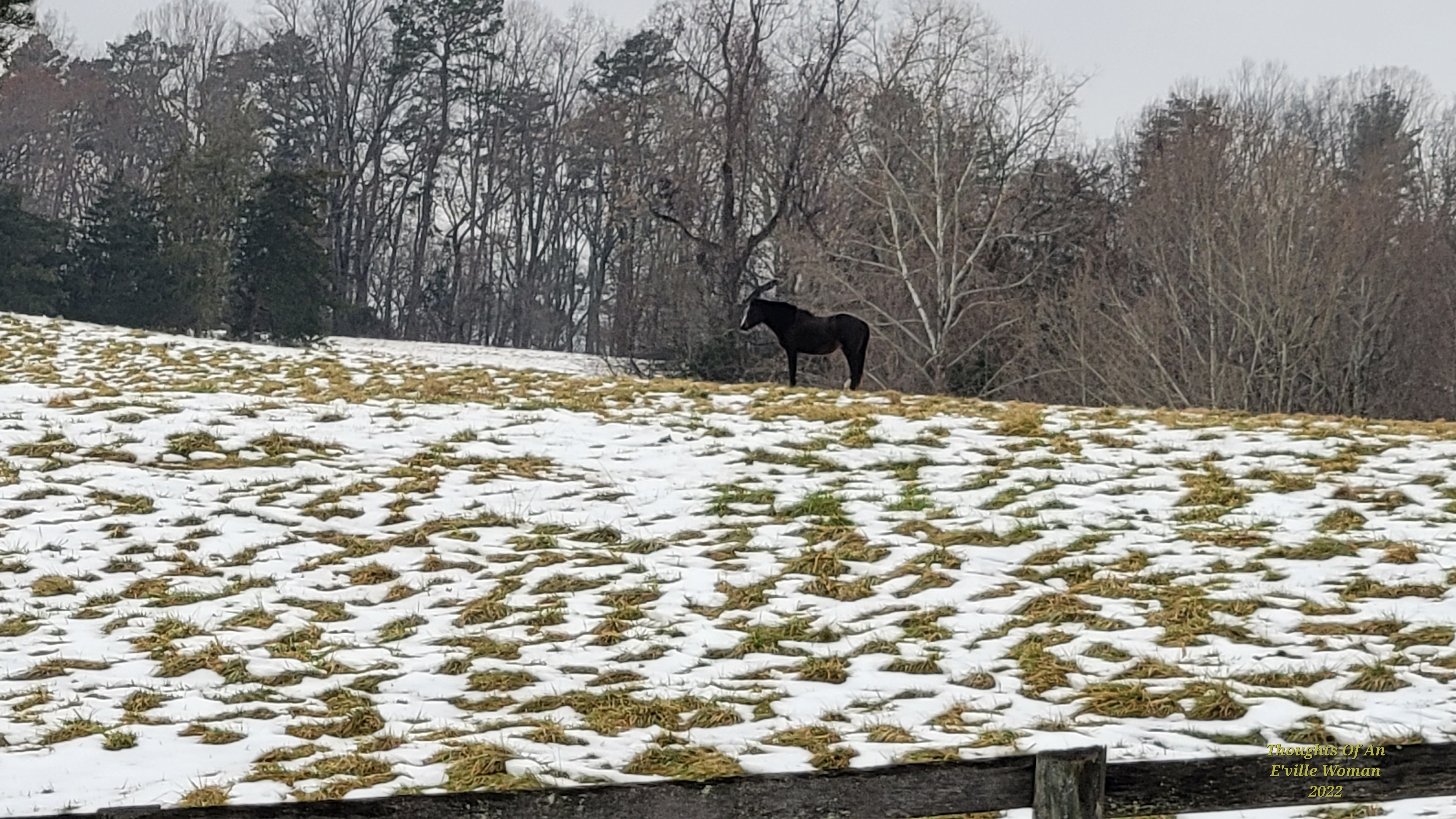 I like the church with the white doors juxtaposed against the white snow. Peaceful. Love the ponies in the field, too.
