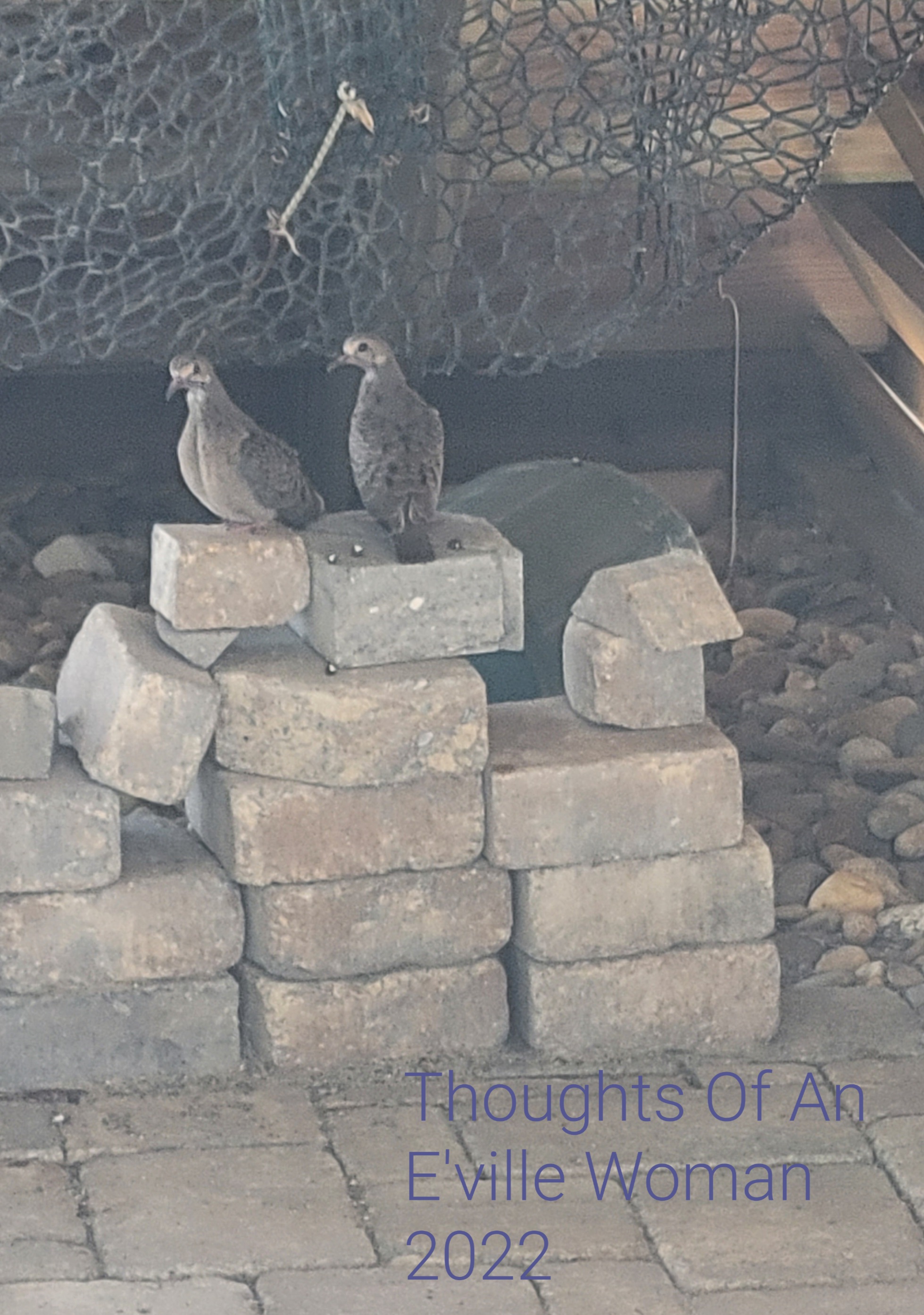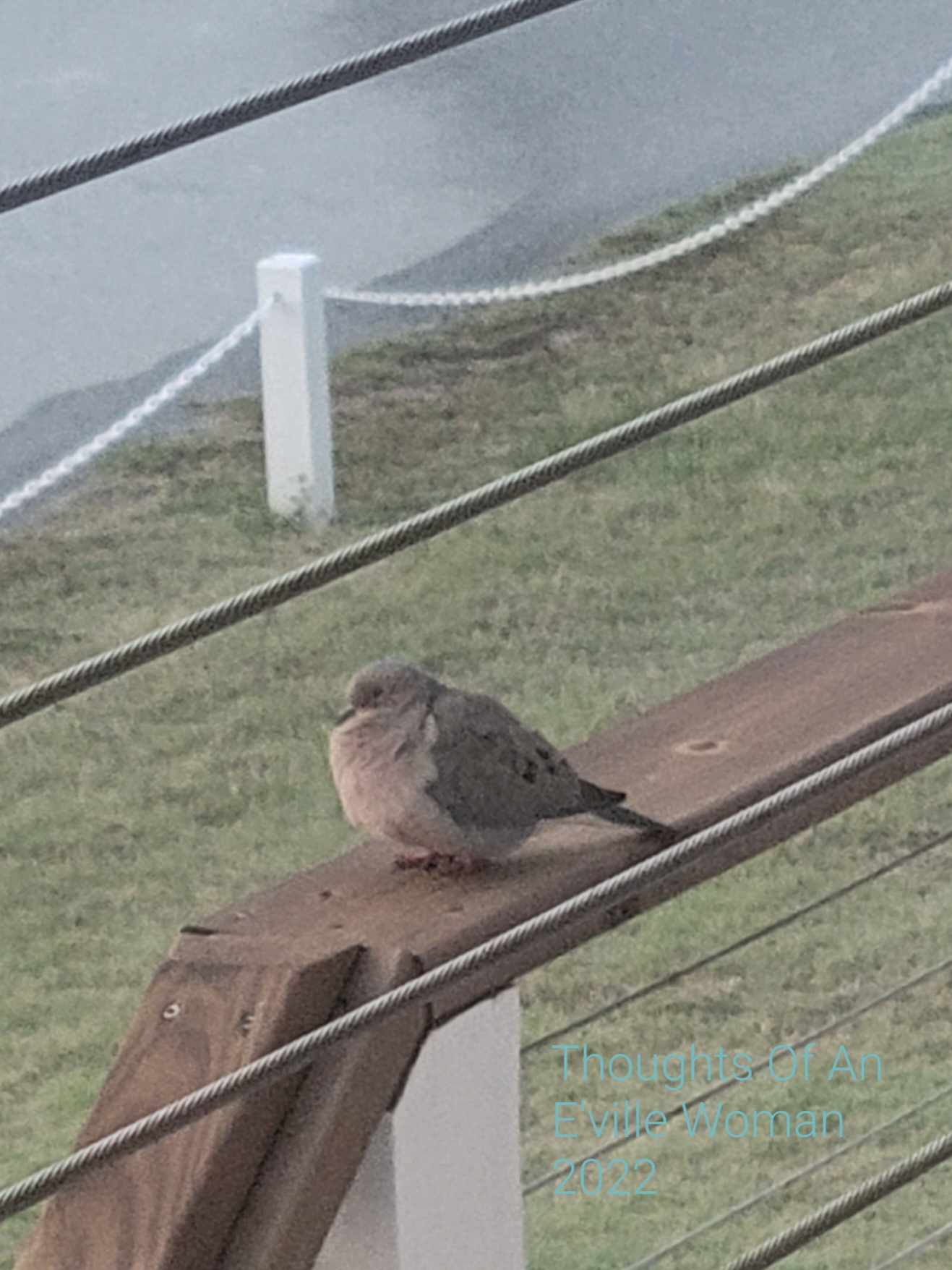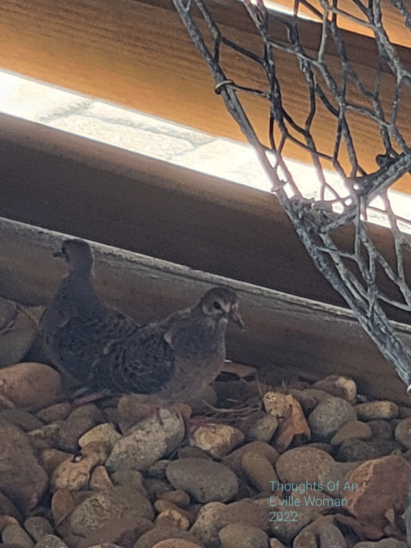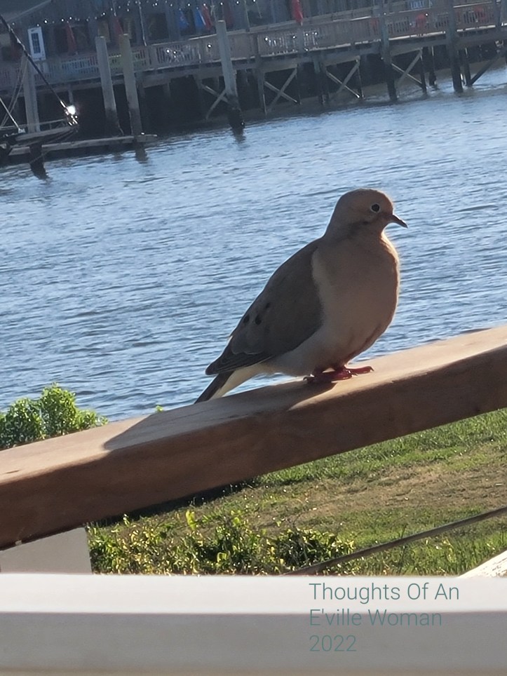 These photos are from our most recent trip down to Holden Beach. When we arrived, the pair took turns on the nest while the other remained nearby on watch. They are the sweetest things to watch and Mr. E’ville and I feel honored they’ve chosen our nest to nest. We’ve read up on mourning doves, their nesting habits, their mating rituals, and how they don’t mind roosting amongst people. Interestingly, they build rather loose, flat, nests that no other bird will find habitable. We’ve noticed this very thing under our deck…it appeared they cobbled their home in 15 minutes or less and not substantial in any way. We also learned they typically have broods of two…this pair had two this season. It was difficult to see the two babies, along with mom and sometimes dad, nestled in their space but they somehow managed the tight squeeze. I regret not having a photo of this to share but I’ve learned to just sit nearby and enjoy them in their environment.