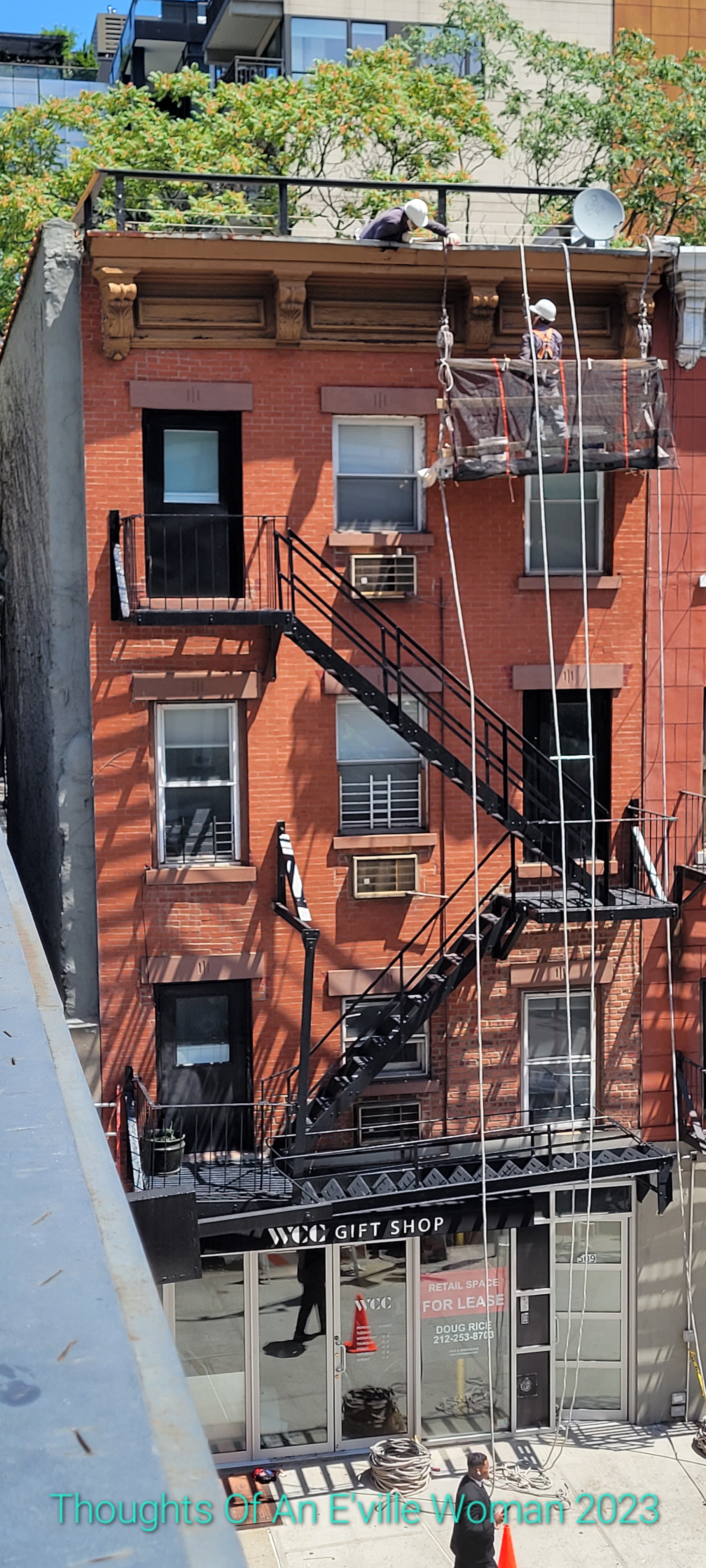 I see six doors but I am sure I missed a couple. Is that someone on a scaffolding window cleaning/ painting?