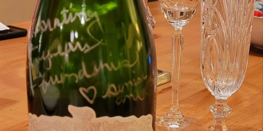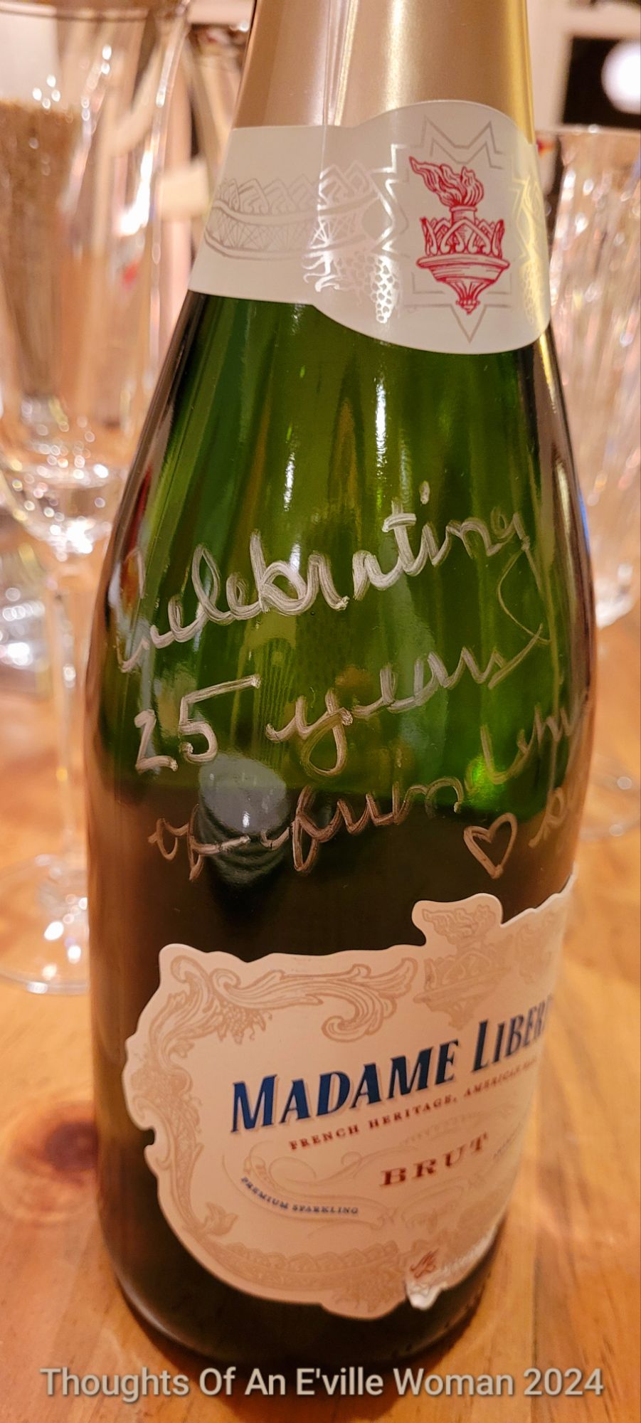 It’s a funny story here, Cee. I actually brought this bottle to our friend’s house LAST YEAR. She was sweet enough to save it for our next dinner together. When she said, “I’ve got a bottle with your name on it!” she was serious….I just thought she was bringing a bottle of bubbles she picked up.