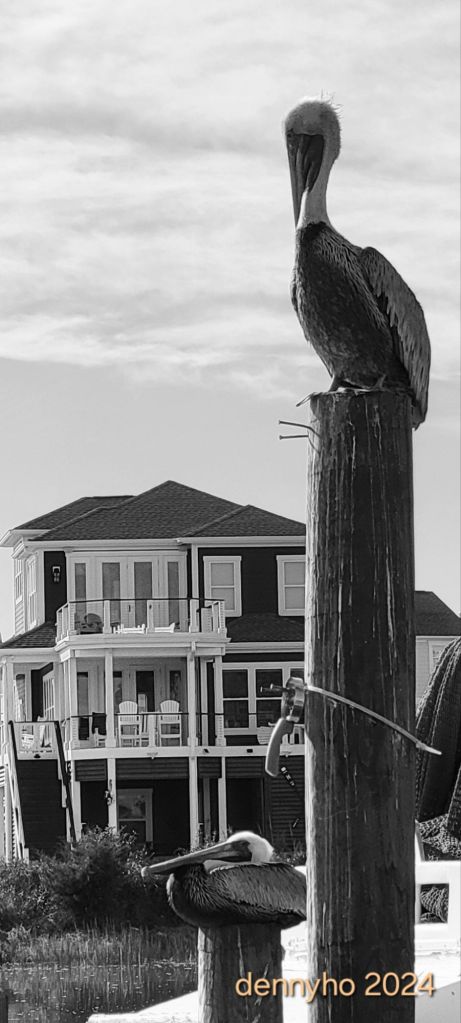 I captured these two pelicans patiently waiting for handouts at the seafood restaurant directly across the waterway from us. When we venture over for fresh fish, there are usually a few hungry guys in line for scraps that inevitably get tossed.