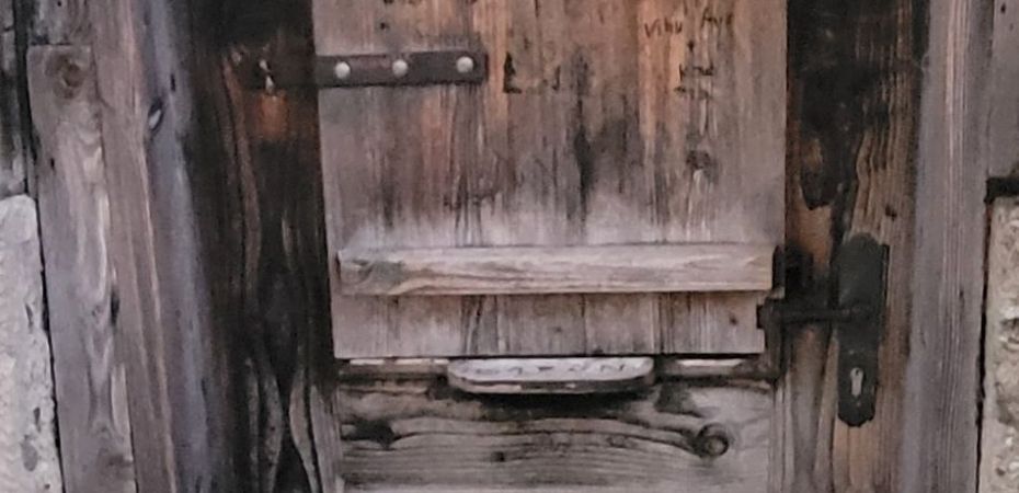 I love these doors. Big, heavy, wooden and I love those massive wrought iron hinges.