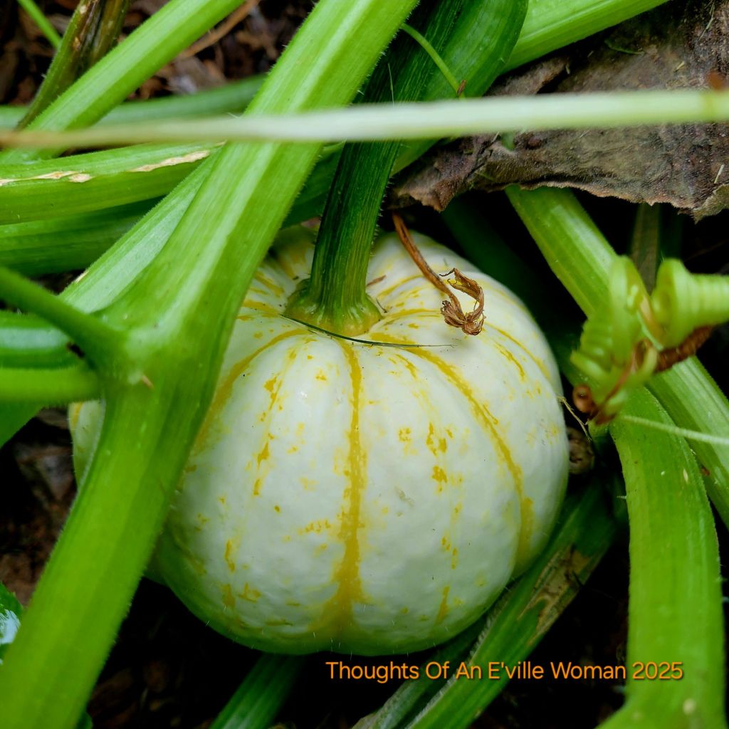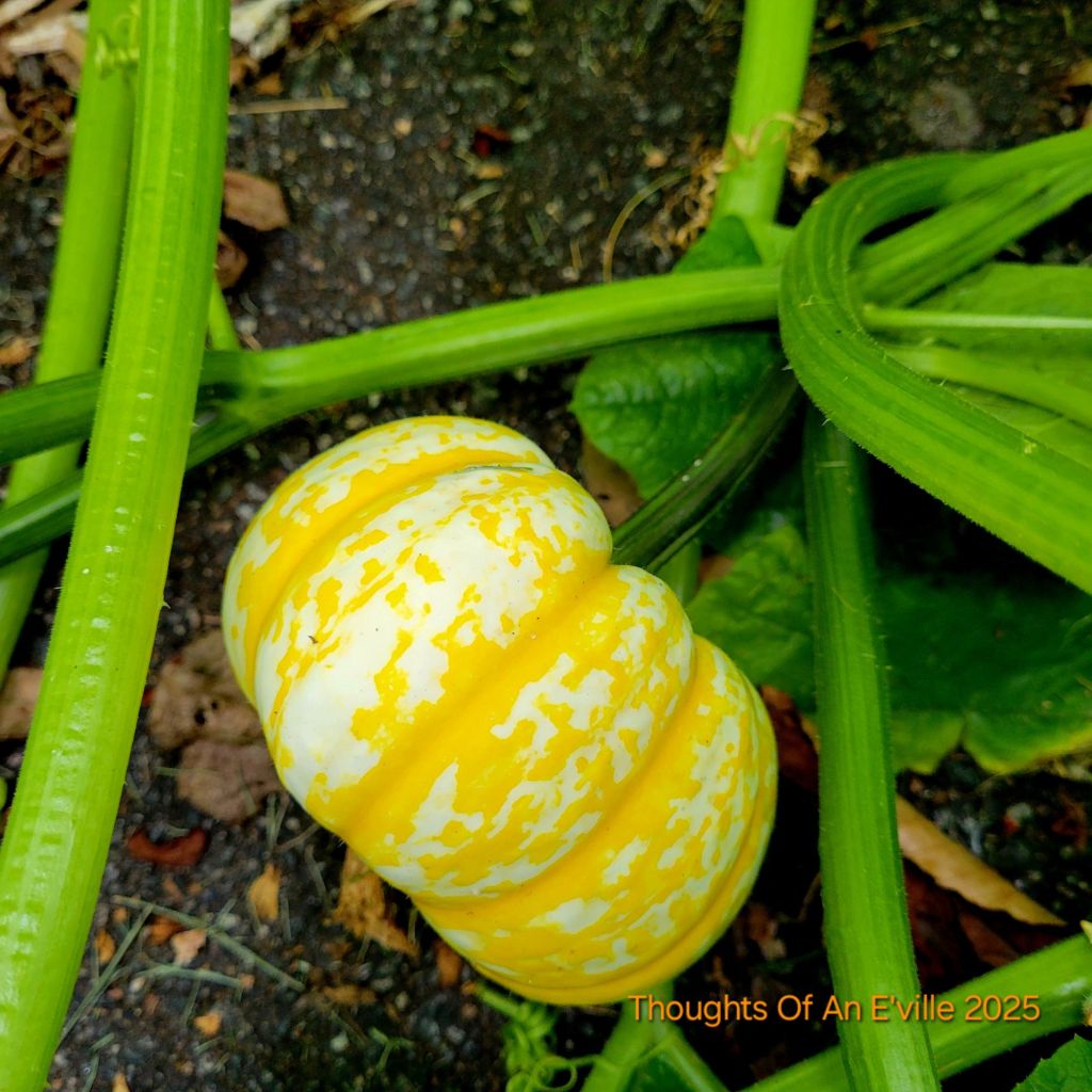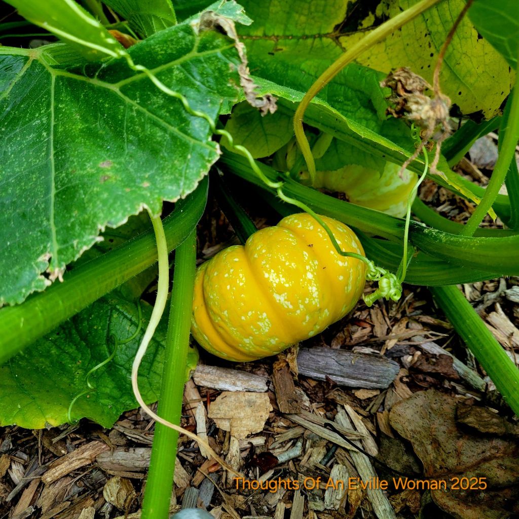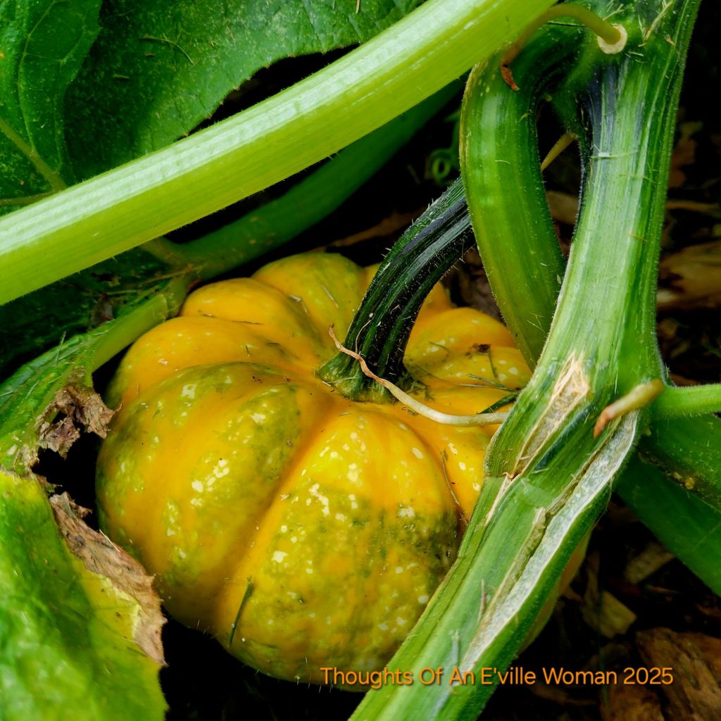 I am by no stretch of the imagination a farmer or gardener. However, I do love what my garden spaces create each year, sometimes a new flower brought in by a passing bird, or this pumpkin patch that appears now and again from my gourds the fall before. This year I’ve counted 21 miniature pumpkins that now are in need of harvesting. The critters of the night have discovered this bounty and before they devour the crop, I will clip the pumpkins and share with family and friends.