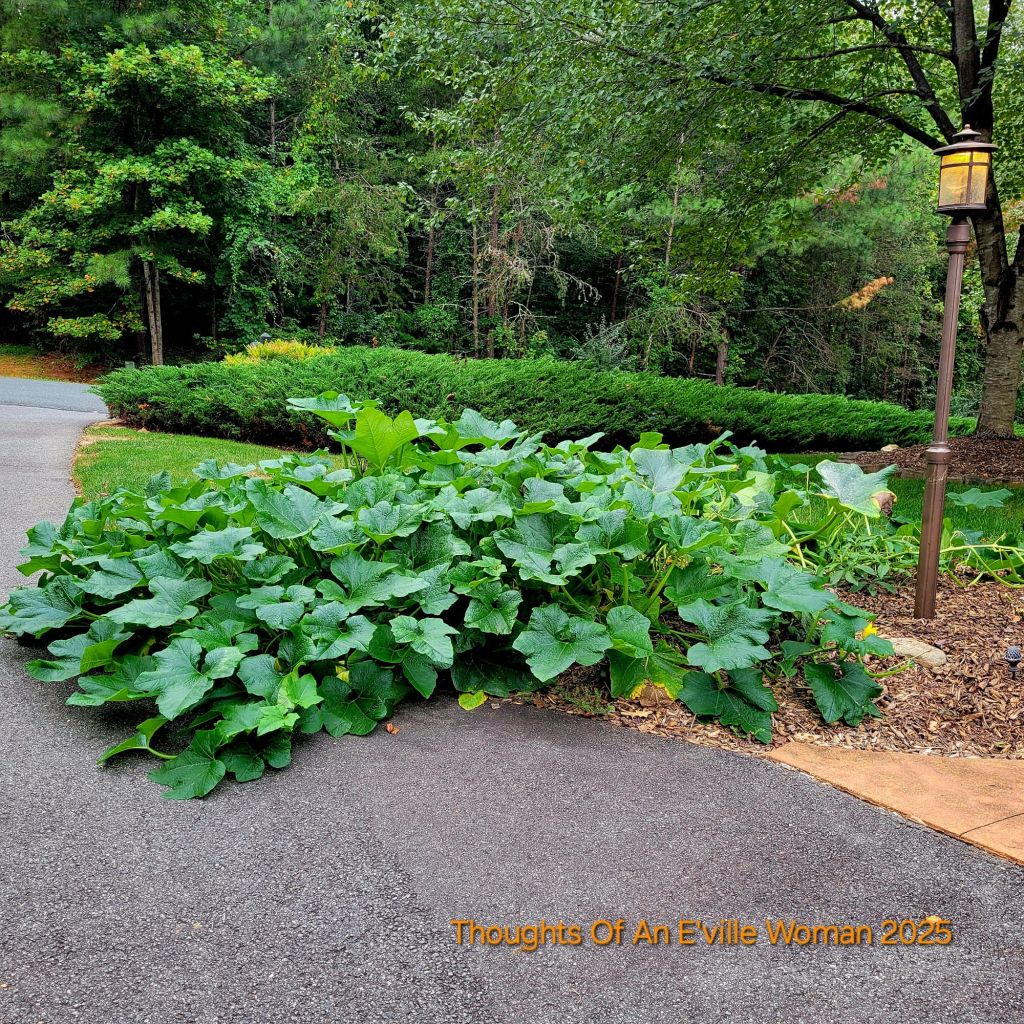 We have pumpkin plants that were planted by the squirrels who bury the pumpkin seeds they steal from the birdseed. We let them grow (water them during dry periods) and then cut the pumpkins in half for the critters to eat. Natural gardens are amazing.