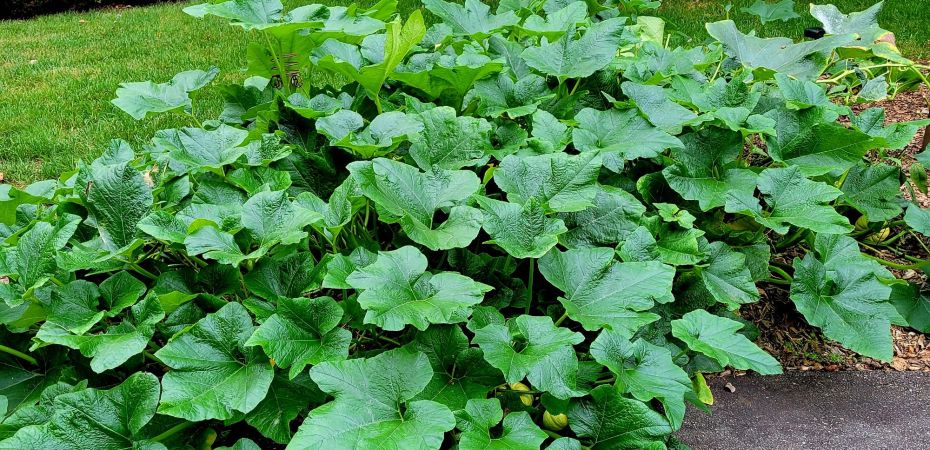 We have pumpkin plants that were planted by the squirrels who bury the pumpkin seeds they steal from the birdseed. We let them grow (water them during dry periods) and then cut the pumpkins in half for the critters to eat. Natural gardens are amazing.