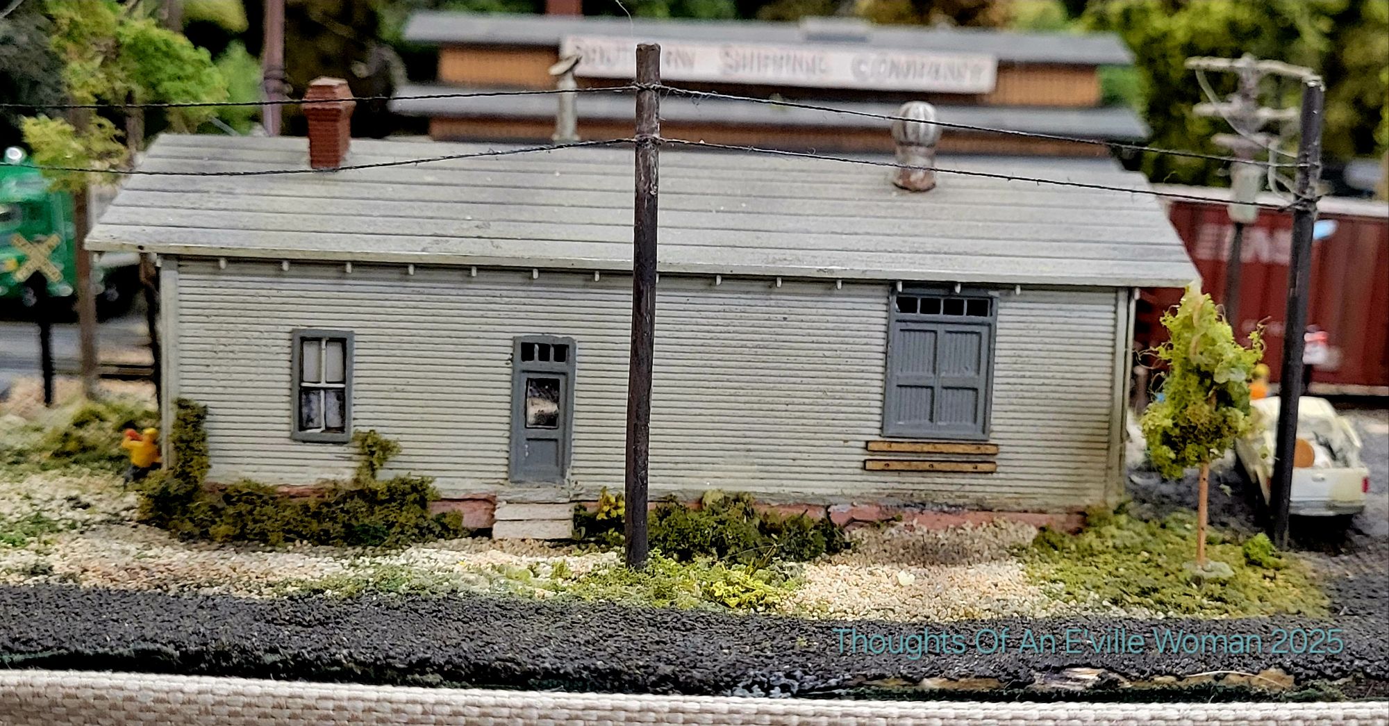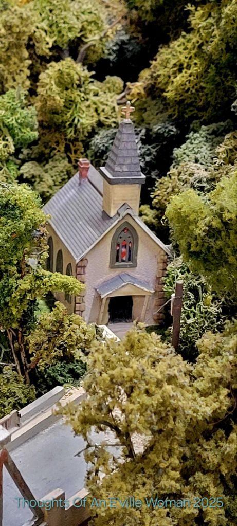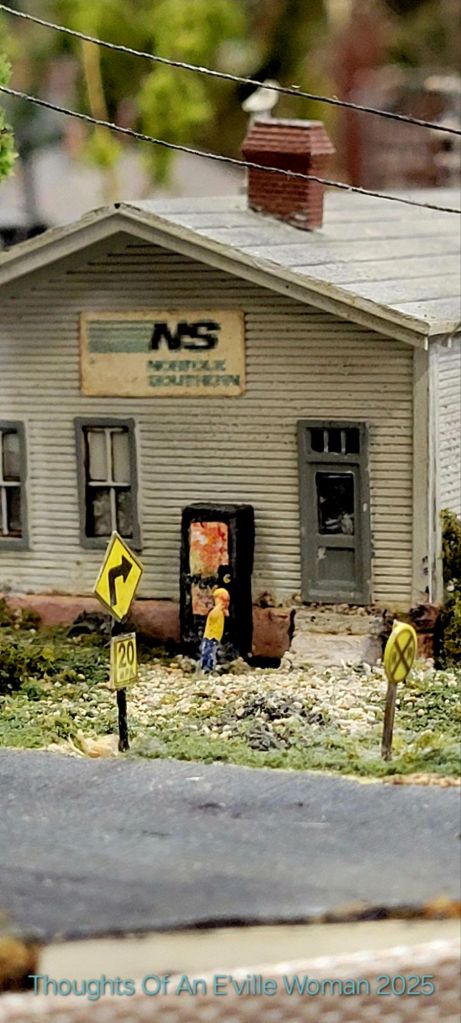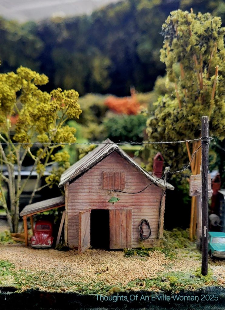 I know nothing about the art of model trains. I do enjoy seeing them very much and while visiting Fleabody’s antique store in Wilmington, Mr. E’ville and I happened upon this rather large display. Unfortunately I did not take a photo of the entire table holding this small town, but I did investigate the homes and shops within. There was no identifying information about the designer or how long it took them to fabricate this Appalachian town. I did read a bit more about train scales here and learned how the scales changed throughout the decades to satisfy the model train designer’s desires for a more compact and space saving hobby experience.