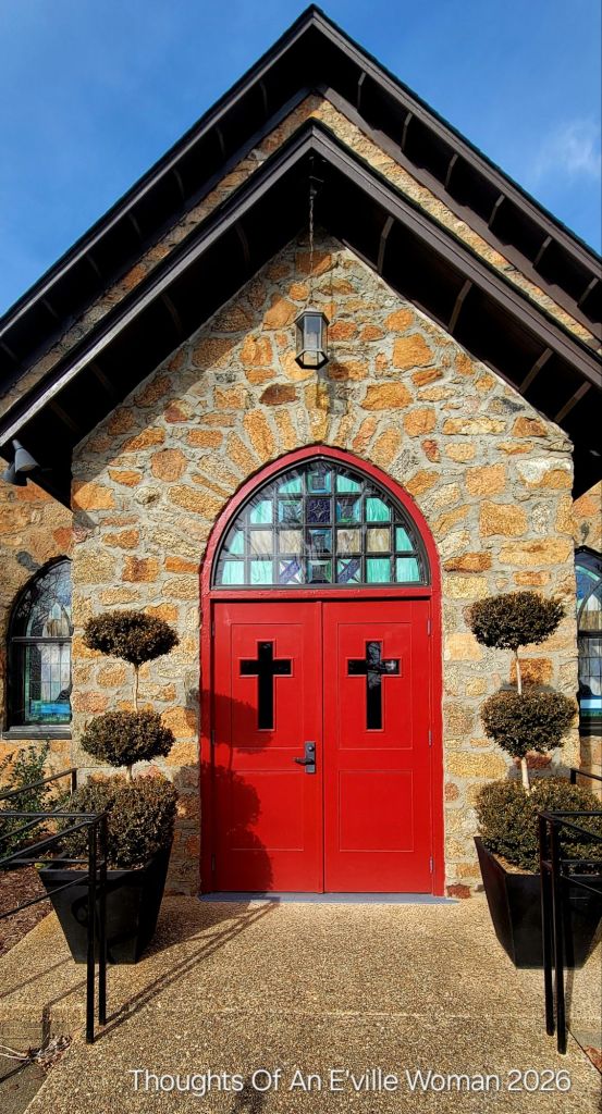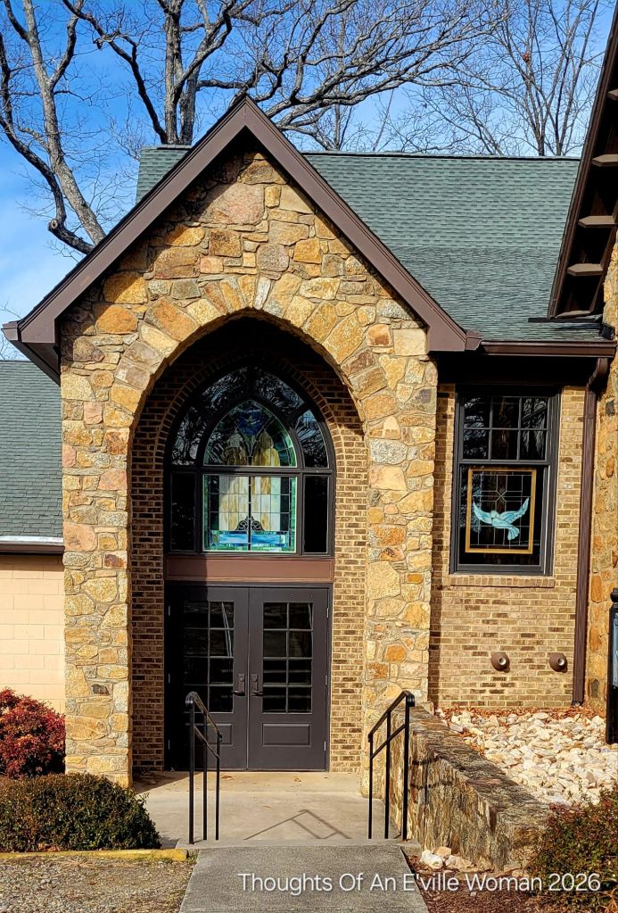 I love the red door and that beautiful stained glass window above the door. the stone work is gorgeous too. I don’t think I’ve a Methodist church with an entry like this before.